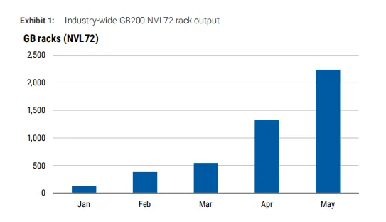 根據(jù)外資機構(gòu)摩根士丹利發(fā)布的「大中華科技硬件」產(chǎn)業(yè)報告顯示,GB200 NVL72 服務(wù)器出貨量在今年第二季呈現(xiàn)爆發(fā)式增長,預(yù)計將達到 6000 柜,較首季實現(xiàn)數(shù)倍激增。具體來看,五月出貨量已從四月的 1000 - 1500 柜大幅提升至 2000 - 2500 柜,六月預(yù)計將繼續(xù)攀升,第二季總出貨量有望達到 5000 - 6000 柜,遠超首季的 1000 柜。這一增長態(tài)勢在 ODM 廠商的營收數(shù)據(jù)上得到直觀體現(xiàn),例如廣達締造了最強五月營收成績,緯創(chuàng)五月營收也刷新歷史新高。